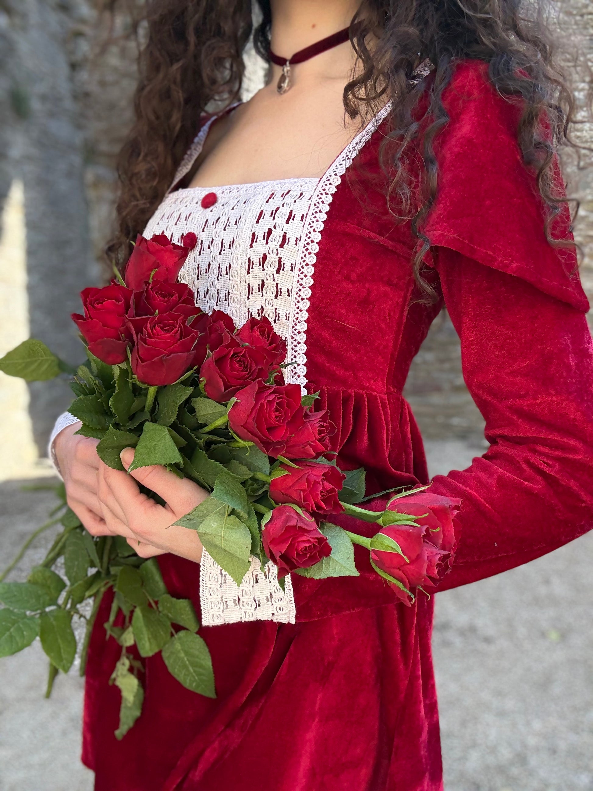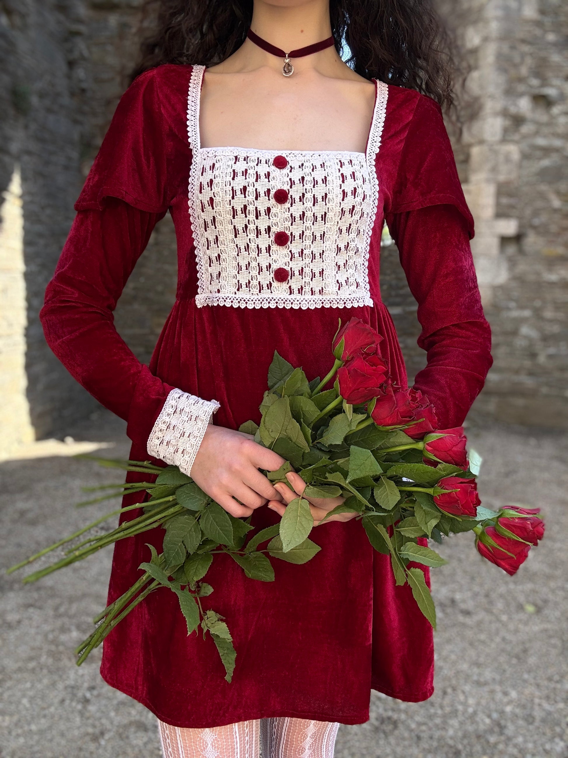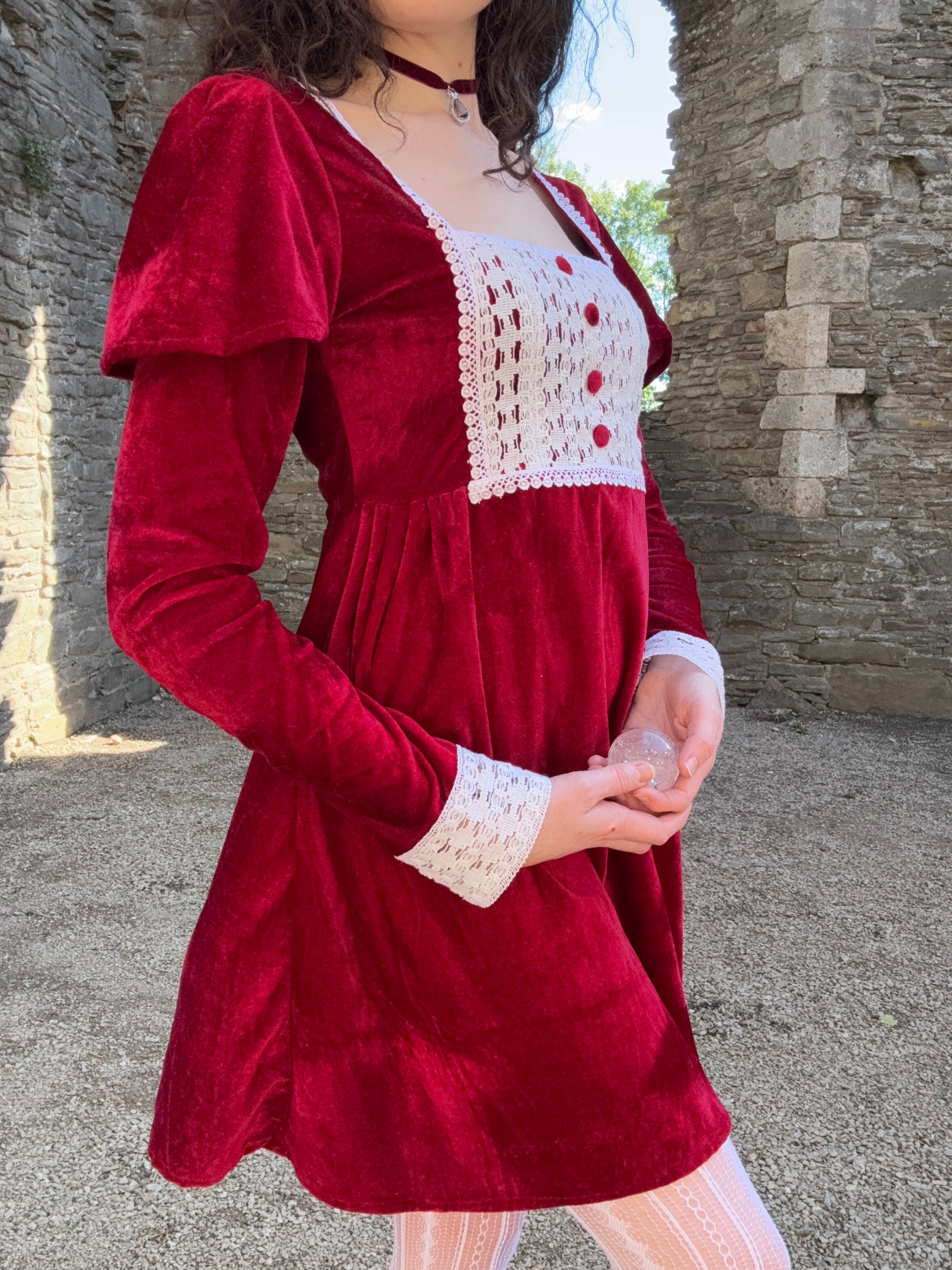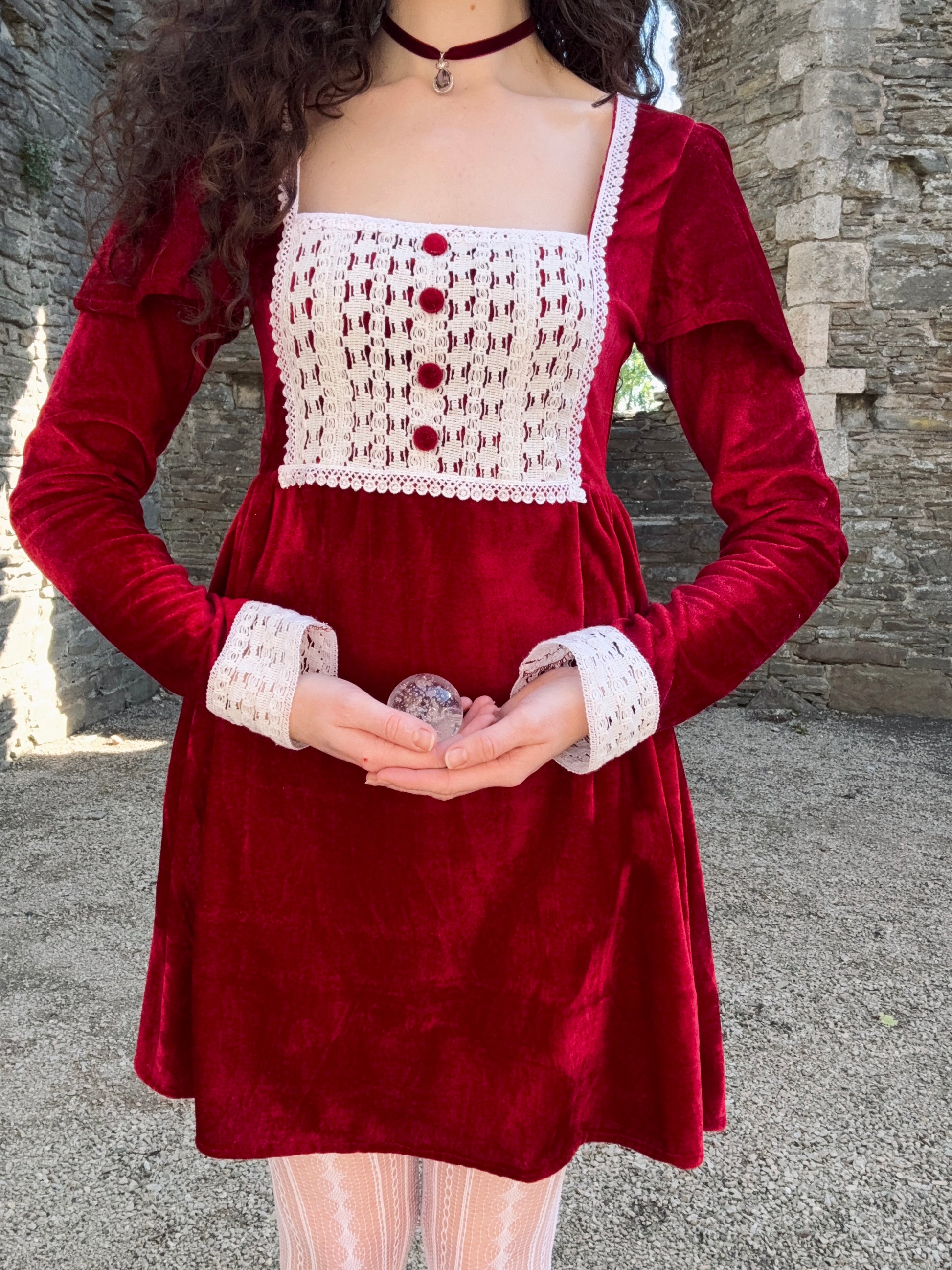 Its delicate wings and lace adornments have stepped straight out of a Rococo painting. Ruby velvet with just enough stretch to slip this baby on over your head and feel the warm, cosy embrace of Heaven's thread. 🪽