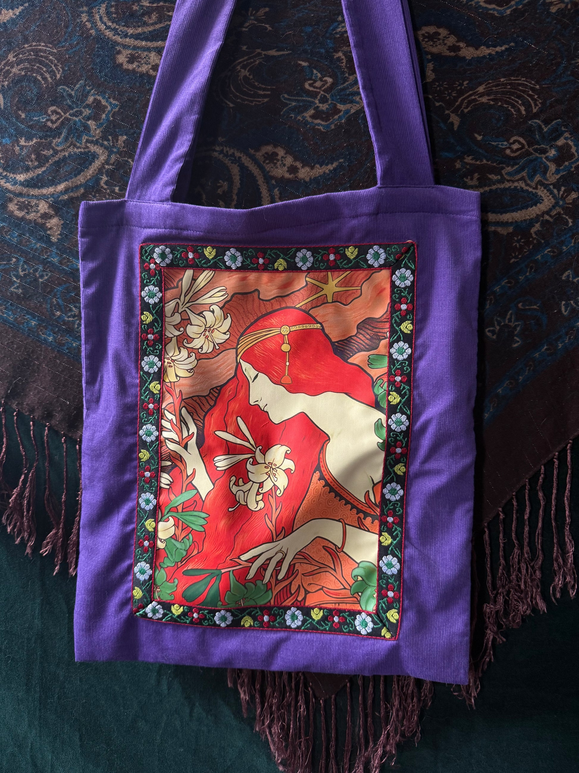Handmade with purple cotton corduroy and lined with a silky Art Nouveau printed viscose.