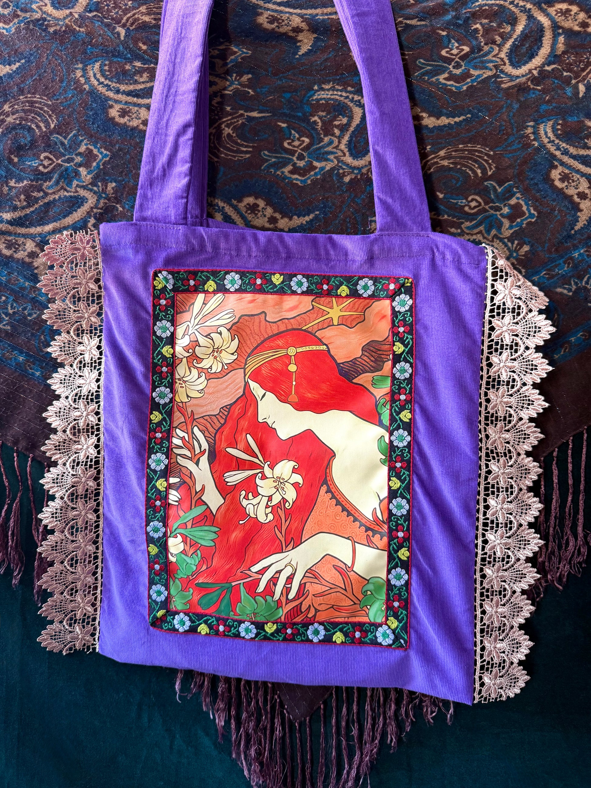 Handmade with purple cotton corduroy and lined with a silky Art Nouveau printed viscose.
